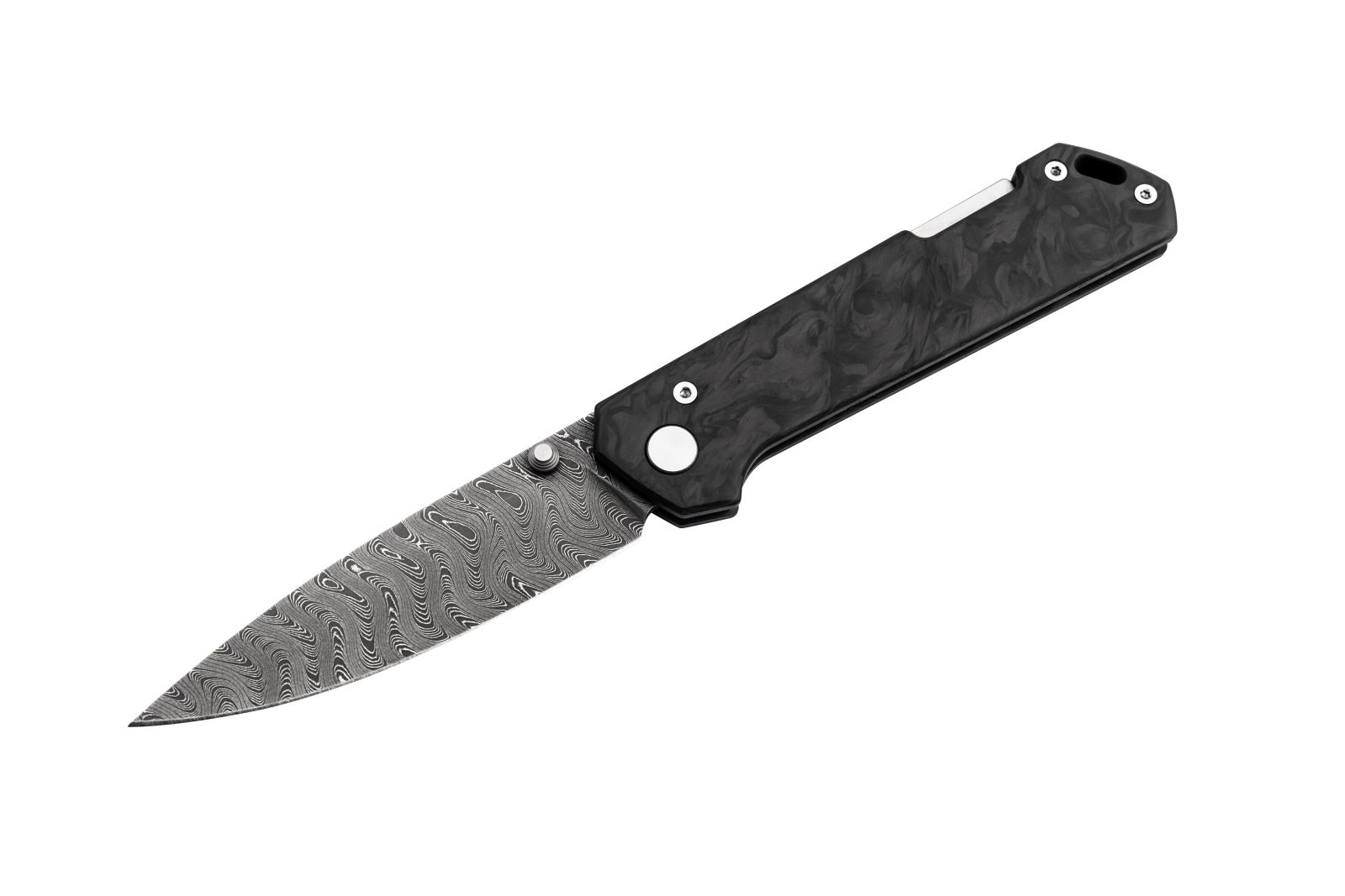 The handle is crafted from premium carbon fiber, complementing the elegant blade with a modern, lightweight, and highly durable character.