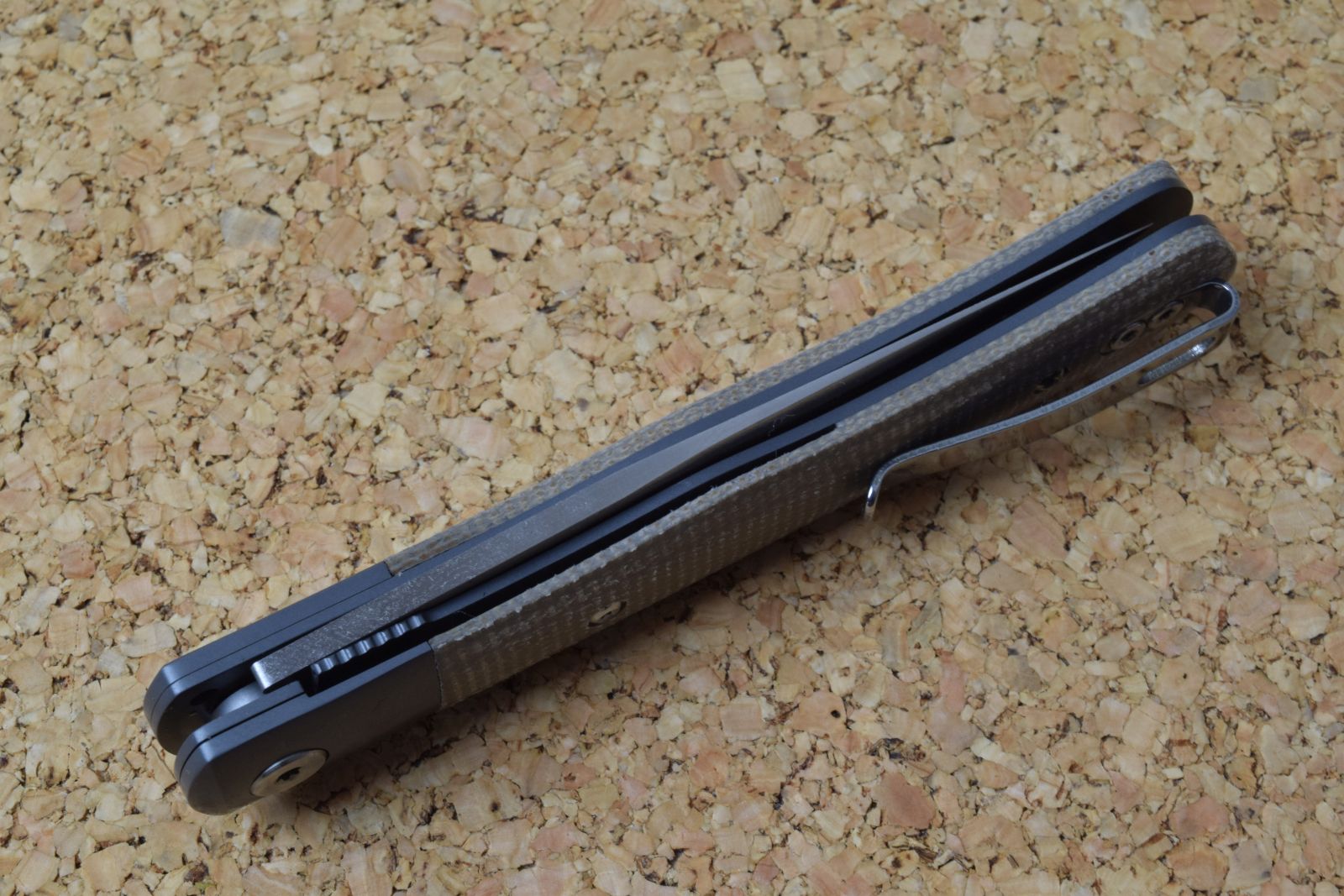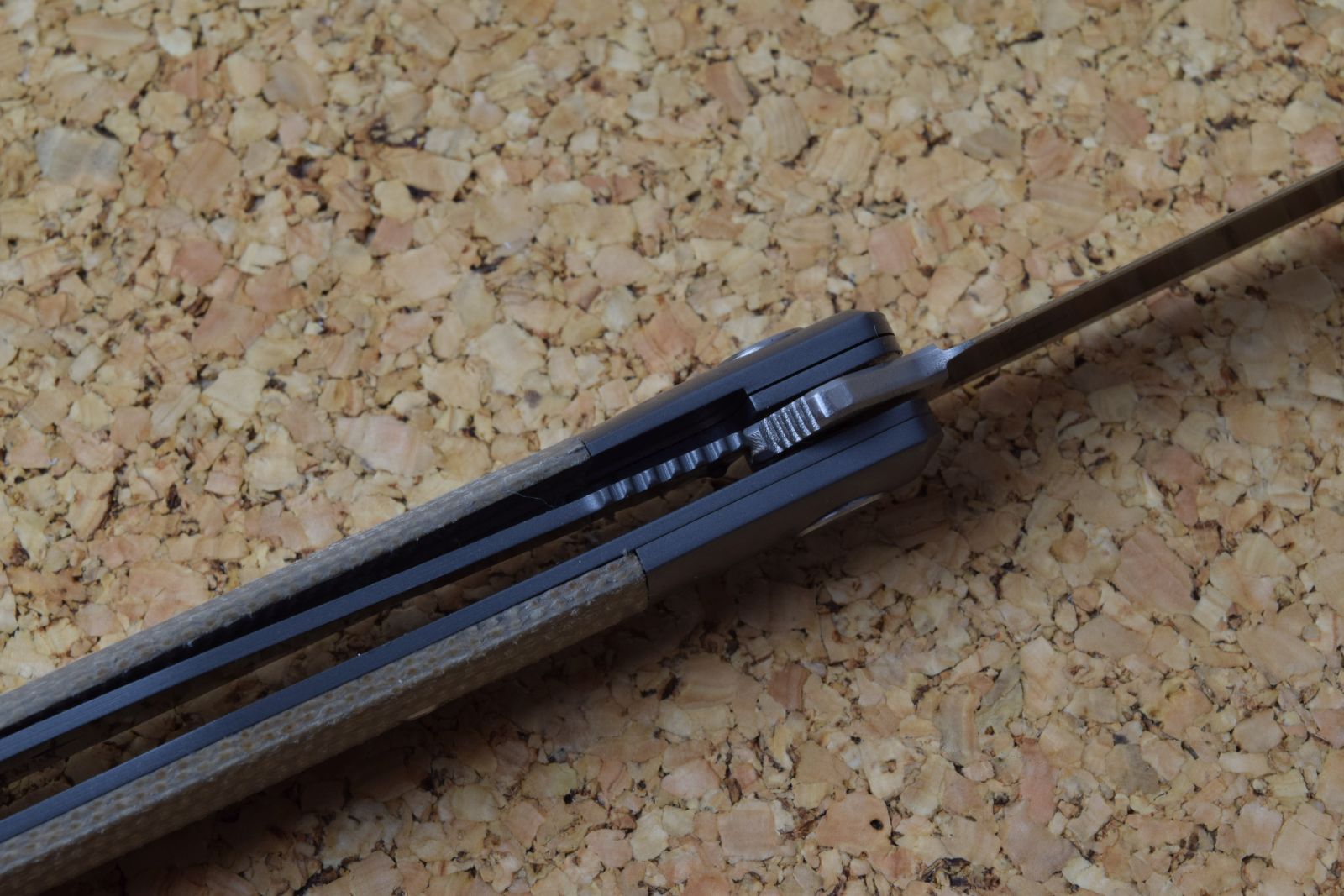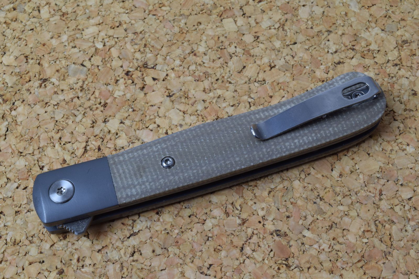Das Böker Plus Modern Trapper Uno verzichtet auf die hintere Griffbacke und setzt auf eine titanbeschichtete Vorderbacke mit handschmeichelnden Griffschalen aus grauem Micarta
