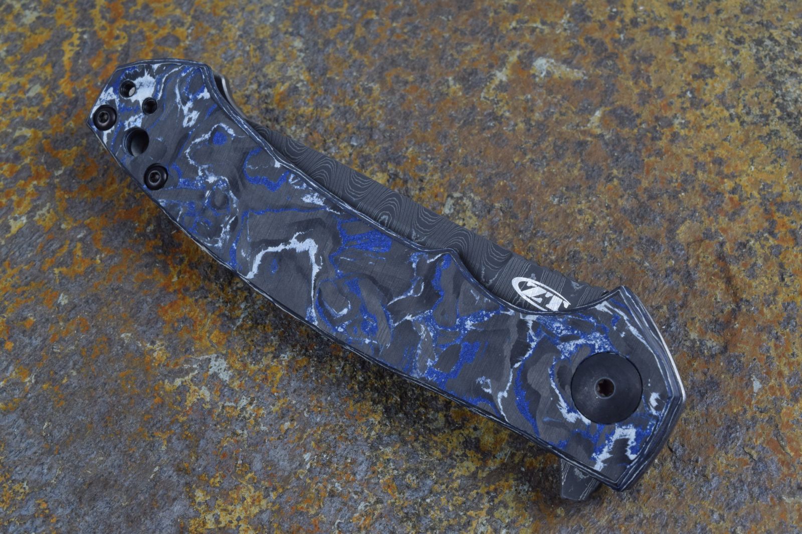 Die vordere Griffbeschalung besteht aus mehrfach marmorierter Kohlefaser, die die solide Konstruktion des Messers mit leichtem Komfort verbindet. Der Titan-Griffrücken bietet einen sicheren Frame-Lock zur Verriegelung der Klinge.
